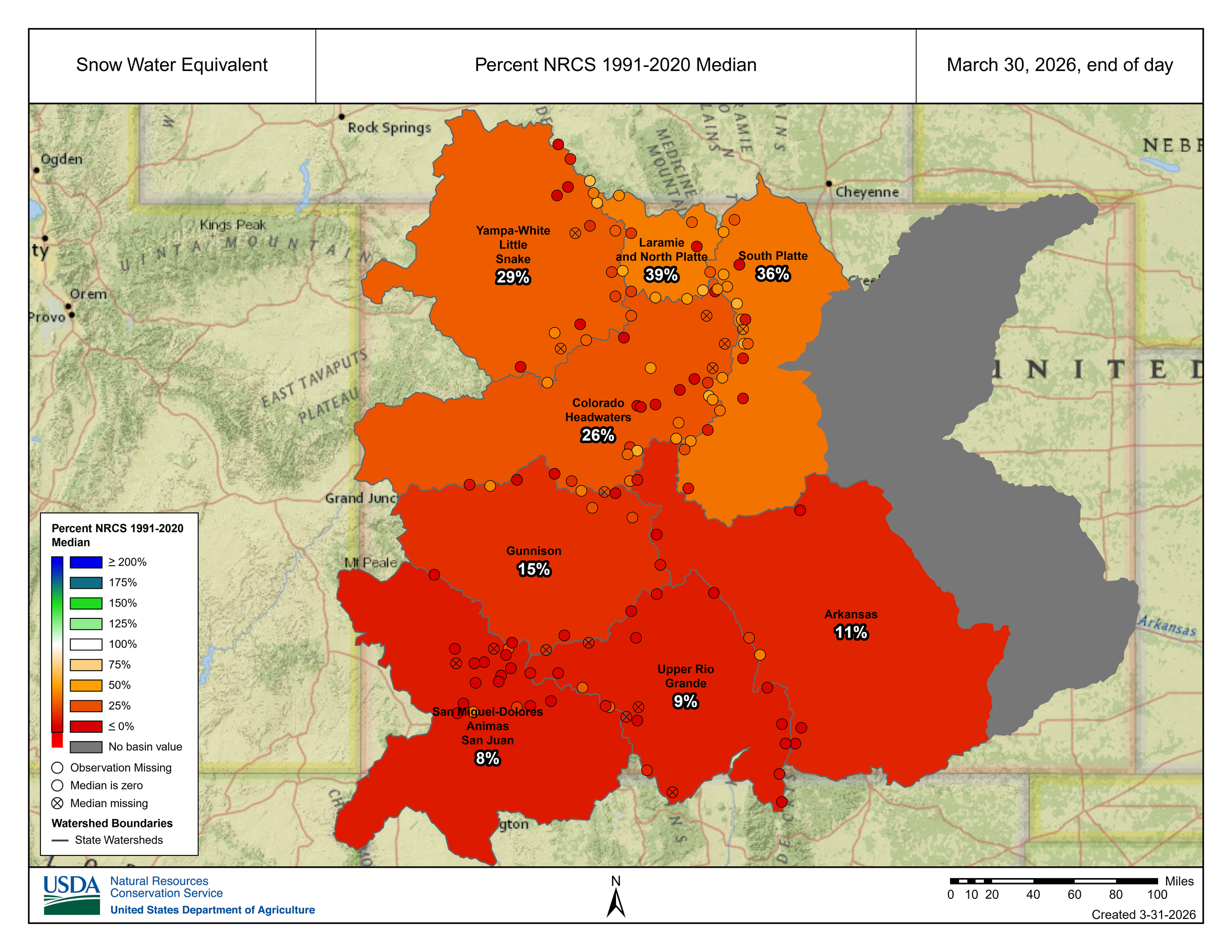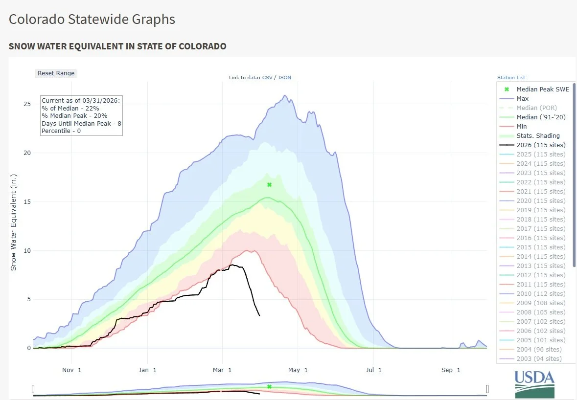 This year, that system is starting from a much lower point than normal. Statewide snowpack is currently around 22 percent of the 1991–2020 median heading into the typical peak period in early April. Winter conditions limited how much snow accumulated, and recent warm temperatures have reduced what was already a smaller snowpack. Together, those factors mean there is significantly less water stored in the mountains than Colorado would typically rely on at this time of year.