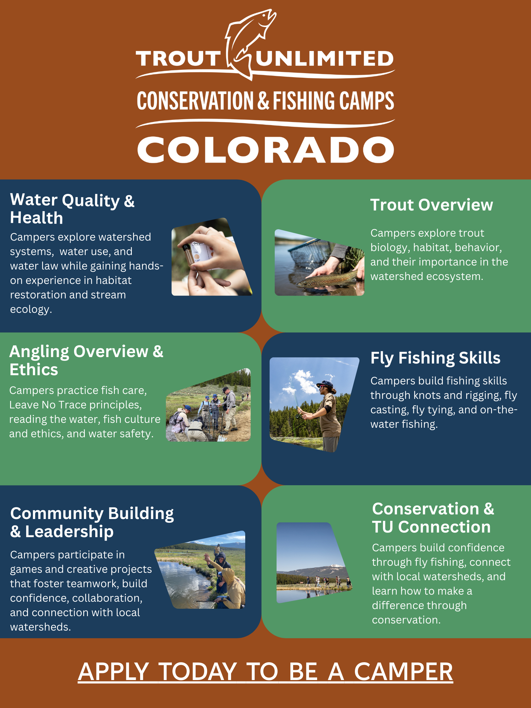 This isn’t your average summer camp. Colorado TU’s Conservation and Fly Fishing Camp is a week of hands-on adventure in the mountains, learning to fly fish, exploring streams, and sharing laughs around the campfire. Campers build confidence, friendships, and leadership skills while discovering how their actions can help protect cold, clean water and healthy fisheries. With experienced mentors, a supportive community, and unforgettable outdoor experiences, camp is both fun and meaningful. Spots are limited—apply today and make this summer one to remember.